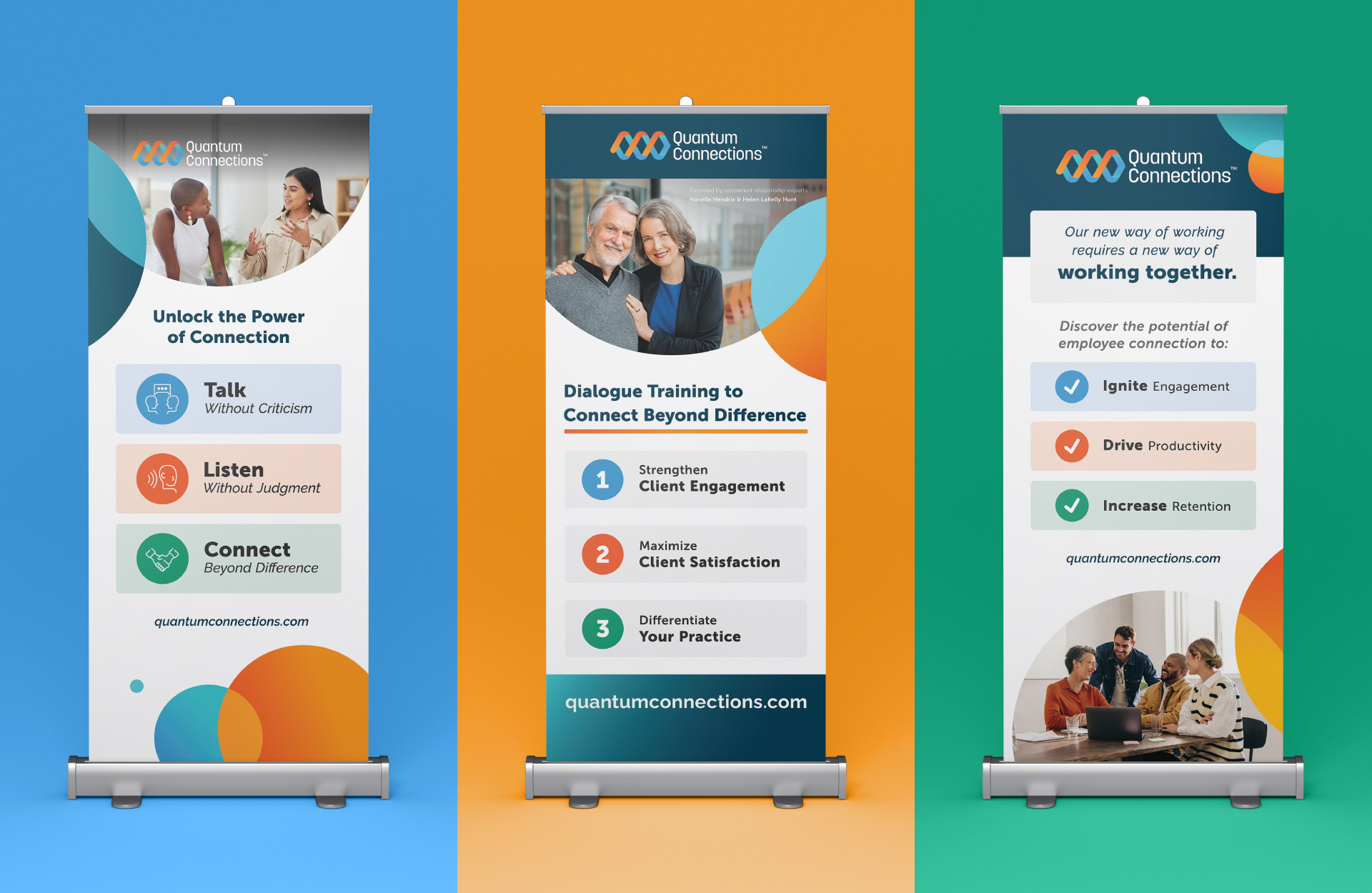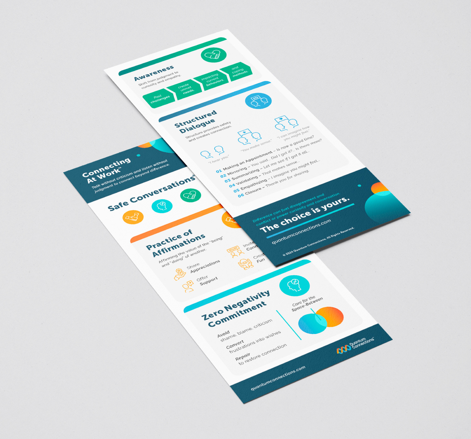 Quantum Connections partnered with DHD Films to rebrand their organization, transitioning from Safe Conversations to a new identity built for scale. The work translated decades of experience in neuro-social science into a clear, contemporary visual system designed to function across business, education, and community settings. As part of the design team, I contributed to the development of the brand’s visual language, helping shape an identity that balances credibility with approachability.